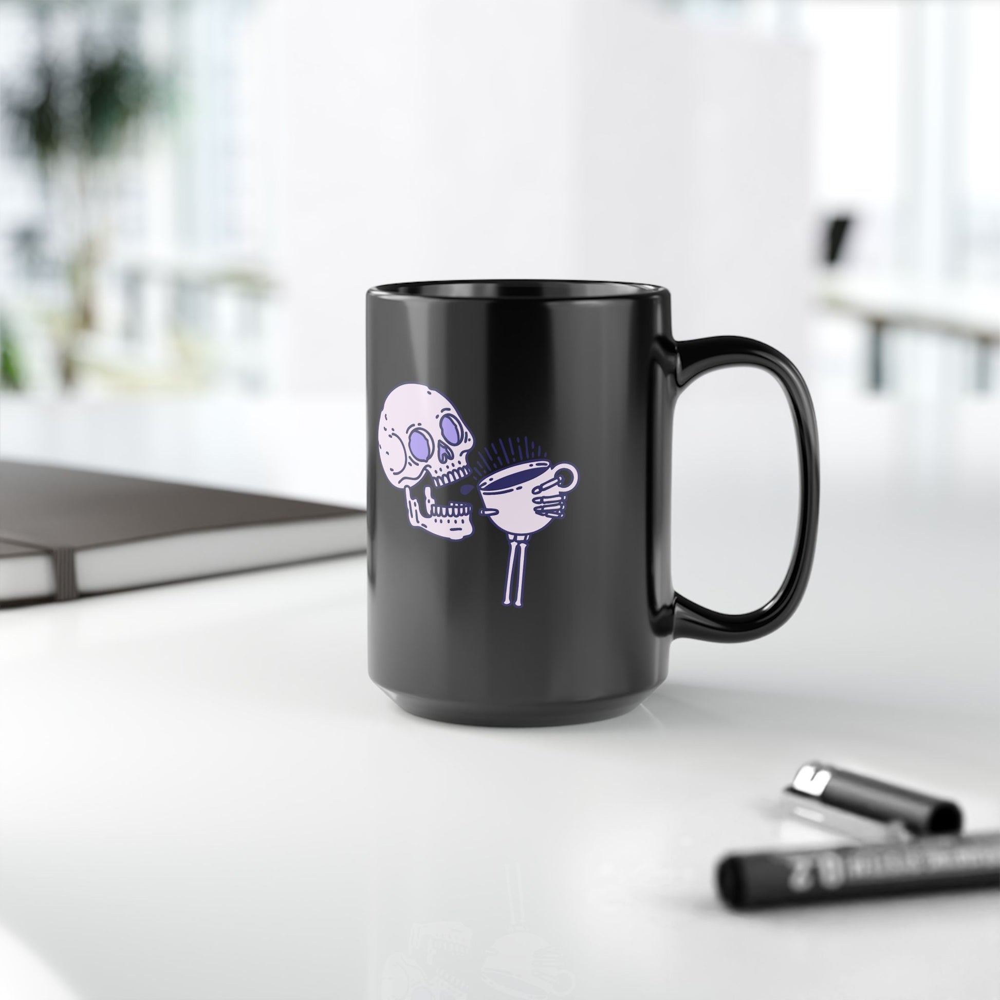 "But first coffee..." because some of us wake up feeling and looking like our friend, the skeleton, on this mug!