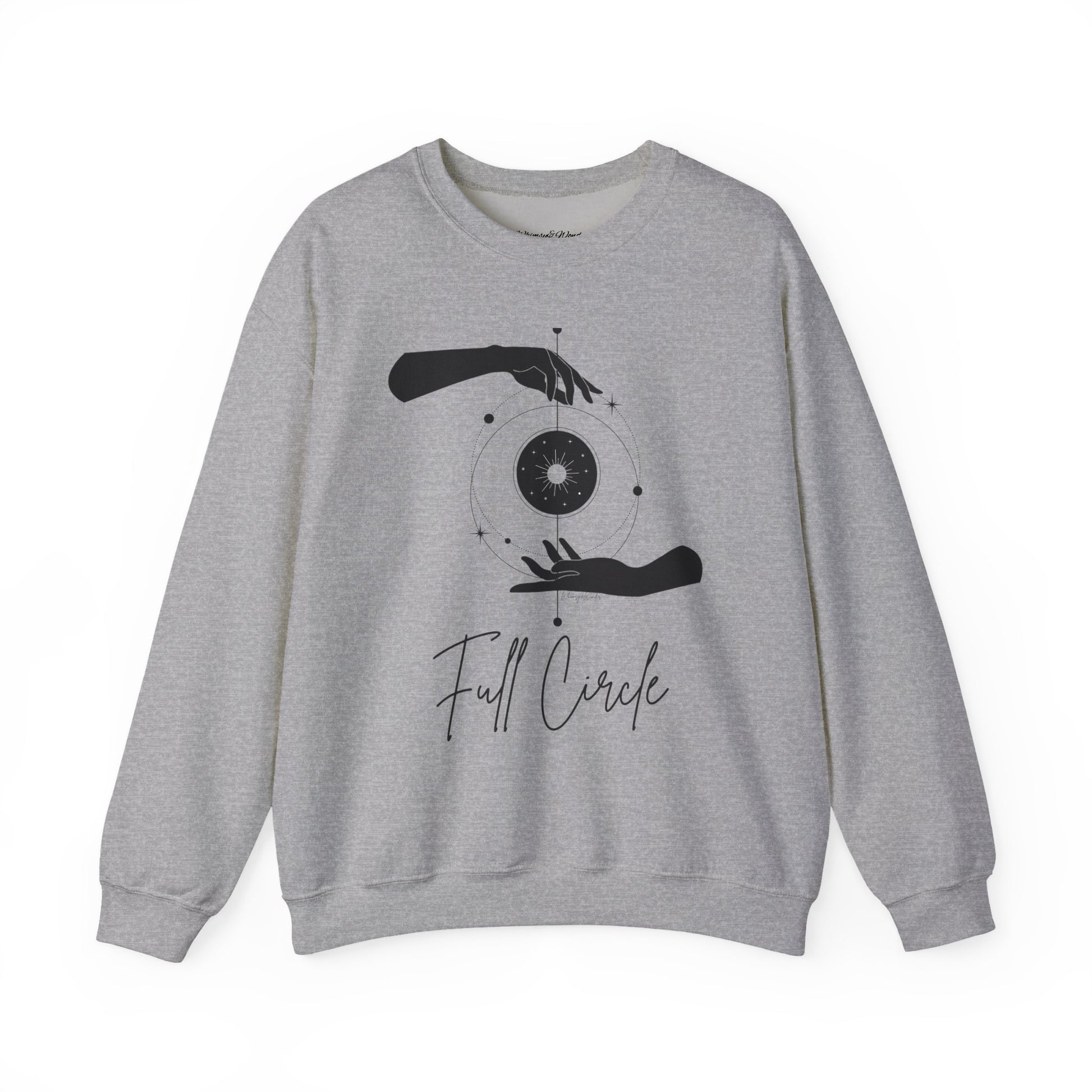 The design shows two graceful hands conjuring, tiny stars drifting between them, and the words “Full Circle” in a handwritten script — minimal, mindful, and a little mysterious.
