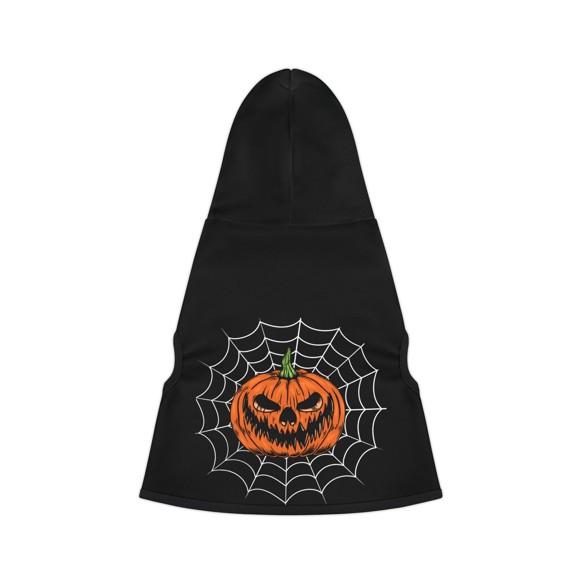 This custom pet hoodie features a sinister grinning jack-o-lantern with spider web background design, perfect for Halloween lovers and pet owners. Made with 100% soft polyester, available in 7 different sizes, and with the option to choose between black or white rib color, this hoodie is a stylish and durable addition to your pet's wardrobe. Seam thread color automatically matched to the design for a cohesive look.